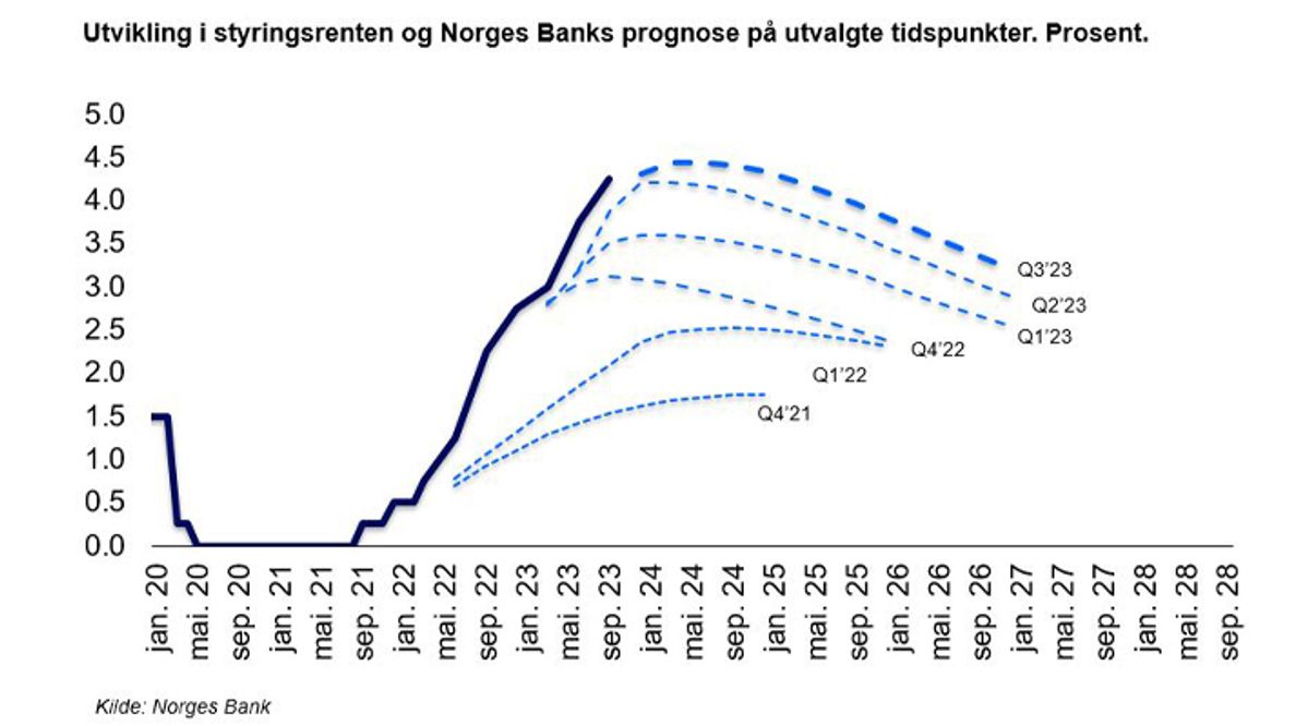 Underveis har sentralbankens prognose for fremtidig rentenivå, den såkalte rentebanen, løpende blitt oppjustert. Dermed har den forventede rentetoppen stadig blitt høyere, og skjøvet lenger ut i tid. Dette er ikke unikt for Norges Bank, men en utvikling vi har sett hos de fleste av våre handelspartnere.