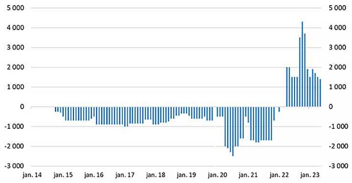 Et energimarked i ubalanseI kjølvannet av Russlands invasjon av Ukraina skjøt energiprisene i taket, og den norske stat hadde enorme petroleumsinntekter i 2022. Inntektene i norske kroner alene, var langt høyere enn det oljekorrigerte budsjettunderskuddet. Staten hadde følgelig en betydelig mengde kroner til overs, som skulle overføres til vår felles sparegris, Statens Pensjonsfond Utland (SPU). Siden SPU utelukkende investerer i utlandet, må de imidlertid først veksles om til utenlandsk valuta. Vekslingene gjennomføres av Norges Bank, som i gjennomsnitt solgte 1,8 milliarder norske kroner hver virkedag i 2022. Sentralbankens kronetransaksjoner skiftet altså ikke bare fortegn og ble mangedoblet i størrelse dette året, men det skjedde i en tid hvor den norske kronen allerede viste klare svakhetstegn som følge av andre forhold.